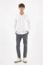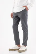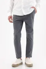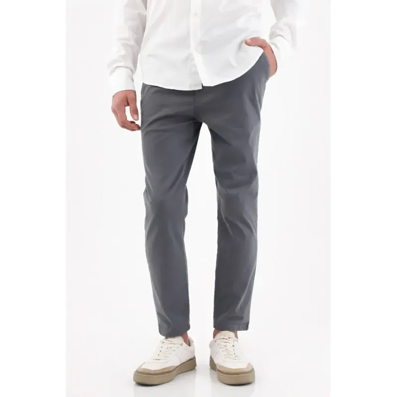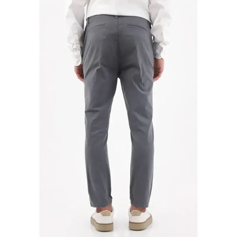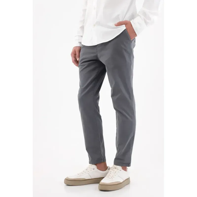 Gris limpio que siempre acierta. Este pantalón chino para hombre en tono gris humo apuesta por el minimalismo funcional: frente liso y bolsillos diagonales para un look pulcro que combina sin esfuerzo. Su corte slim de pierna levemente cónica termina en un tobillo limpio que afina la silueta. Confeccionado en algodón 98% con 2% elastano, acompaña tu ritmo con comodidad y mantiene una estética urbana impecable.