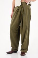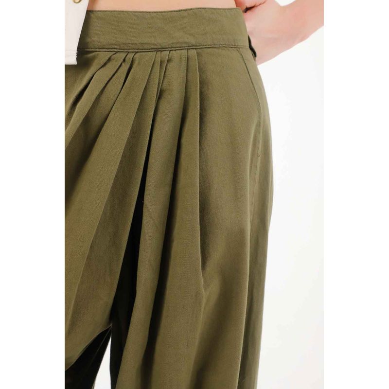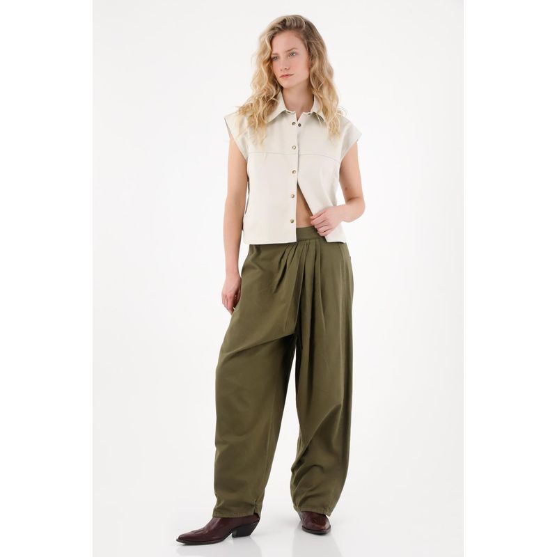 Este pantalón amplio en drill liviano combina una silueta relaxed con drapeados frontales que aportan movimiento y sofisticación a tu look. La pretina con botonadura lateral suma un detalle de estilo único, perfecto para destacar.