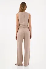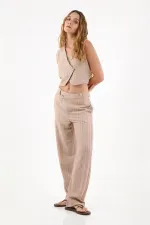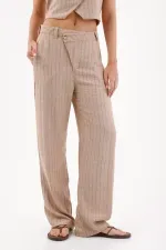 Asimetría que eleva tu look. Este pantalón beige de pierna ancha luce rayas finas verticales y un cruce asimétrico con botón visto en la cintura, un detalle sutil que suma diseño. El fit amplio crea una silueta relajada y actual, en tela tipo lino fácil de combinar en el día a día.