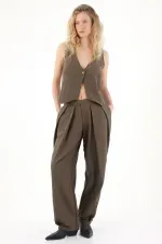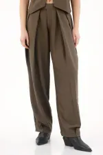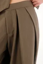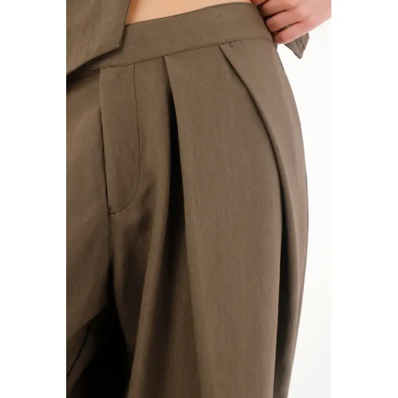 Este pantalón wide leg en verde oliva se mueve con una caída fluida gracias a su tejido de viscosa, perfecto para un look urbano y relajado. Los pliegues frontales marcan la cintura y abren la pernera, creando ese efecto amplio y elegante que estiliza al andar. La pretina definida mantiene el frente limpio y los bolsillos laterales suman actitud casual sin romper la silueta. Largo completo para un gesto moderno y sofisticado en cada paso.
