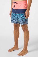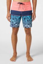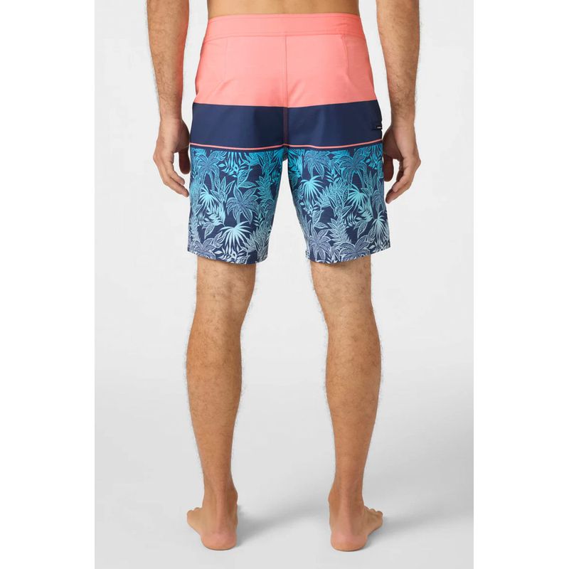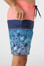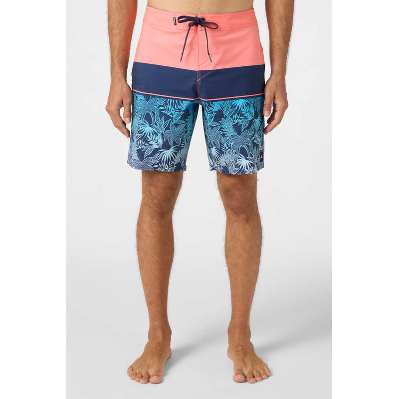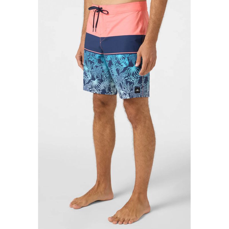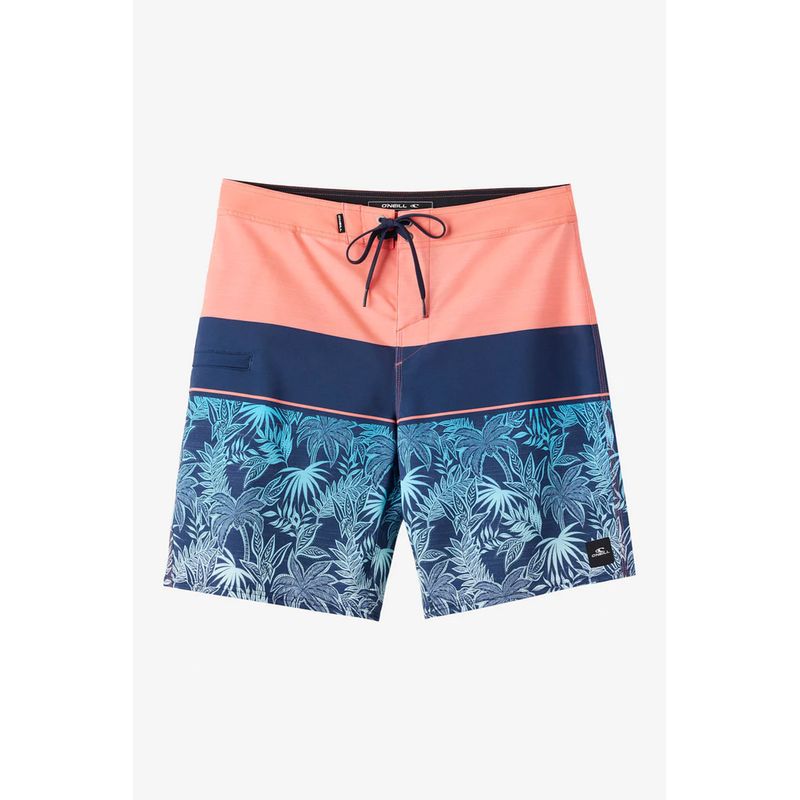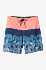 Un boardshort masculino con diseño en franjas naranjado, azul y azul con plantas y palmeras que puedes usar en piscina, mar y río, ya que cuenta con nuestra tecnología O'NEILL HYPERDRY que repele el agua, ayuda a evitar su absorción y acelera el tiempo de secado.