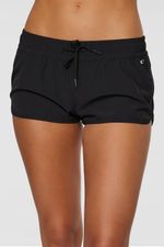 SHORT LANEY STRETCH 2 PULGADAS para mujer, estilo playero son elásticos y clásicos, tienen un lavado de color sólido, detalle de dobladillo de delfín y ajuste con cordón frontal y cuentan con un bolsillo oculto de malla en la cintura. Este diseño de color negro, te dará un look moderno tanto para la playa como para la ciudad