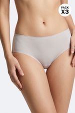 Panty en paquetería X3, elaborado en microfibra, un material que destaca por su suavidad y comodidad. Su efecto satinado aporta un toque de lujo y feminidad. Diseñado con una silueta tipo hipster, ofrece una cobertura media sobre las piernas y glúteos. Incorpora tecnología de corte láser termofusionado en la cintura evitando que se enrolle bajo la ropa o se marque en la piel, junto a la tecnología corte láser sobre las piernas que brinda un acabado mas limpio.Además, cuenta con un refuerzo en algodón que garantiza frescura e higiene en la zona íntima.