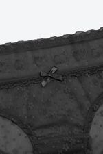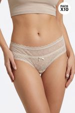 Pack de 10 panties tipo hipster con encaje floral y moño decorativo. Silueta con cobertura media y banda ancha que se ajusta suavemente a la cadera. Con refuerzo en algodón.