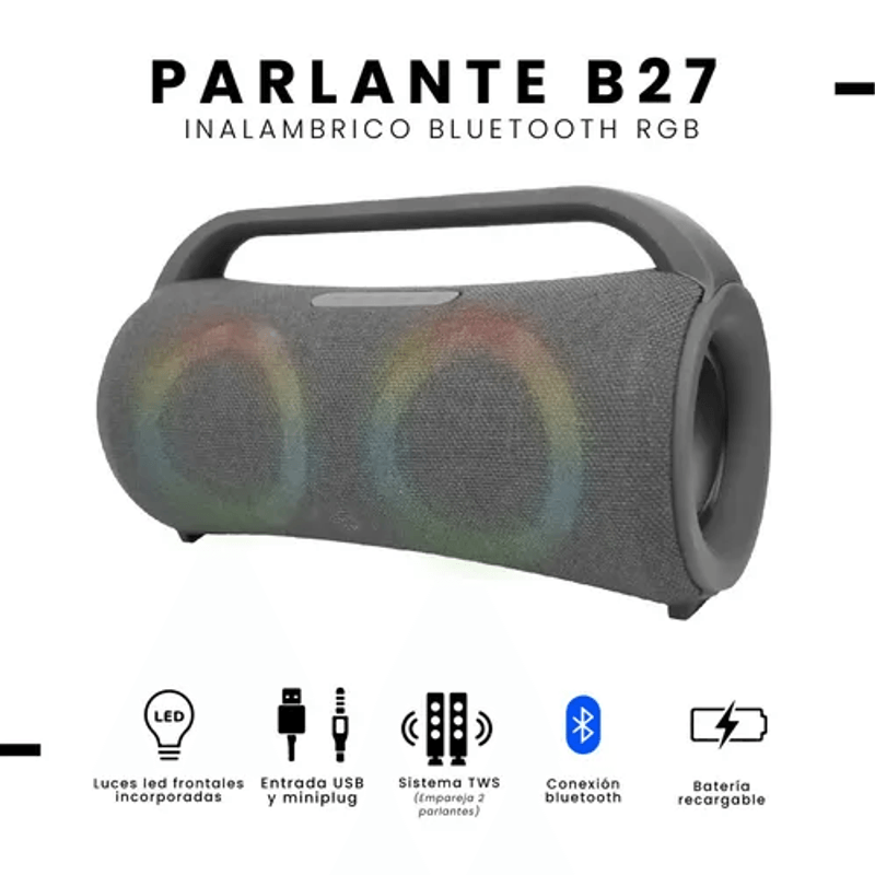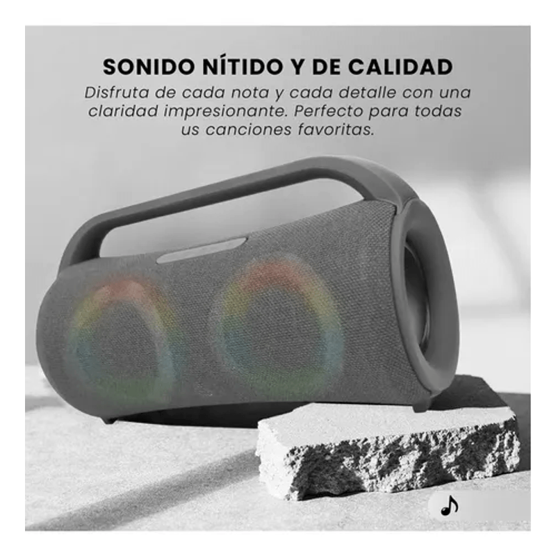 Sonido potente y nítido para disfrutar de cada detalle en tu música favorita. Luces LED RGB integradas que crean un ambiente vibrante. Entrada USB y miniplug para múltiples opciones de conexión. Tecnología TWS para emparejar dos parlantes y duplicar la potencia. Conexión Bluetooth estable y de largo alcance. Batería recargable para llevar la música a cualquier lugar.