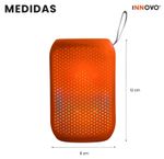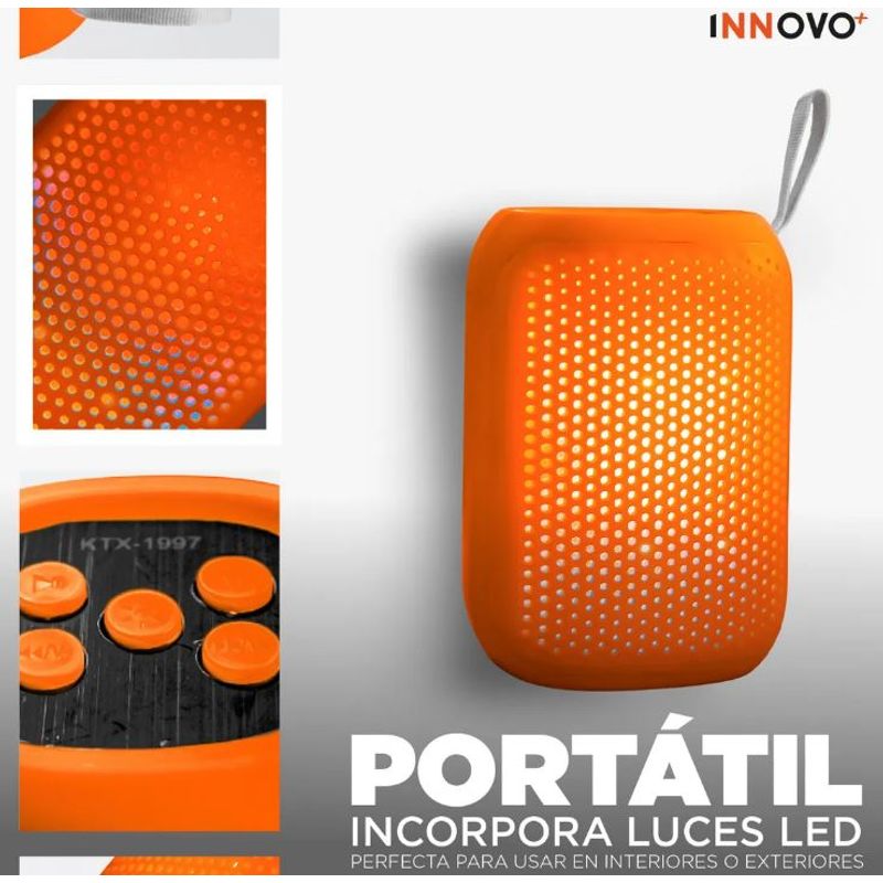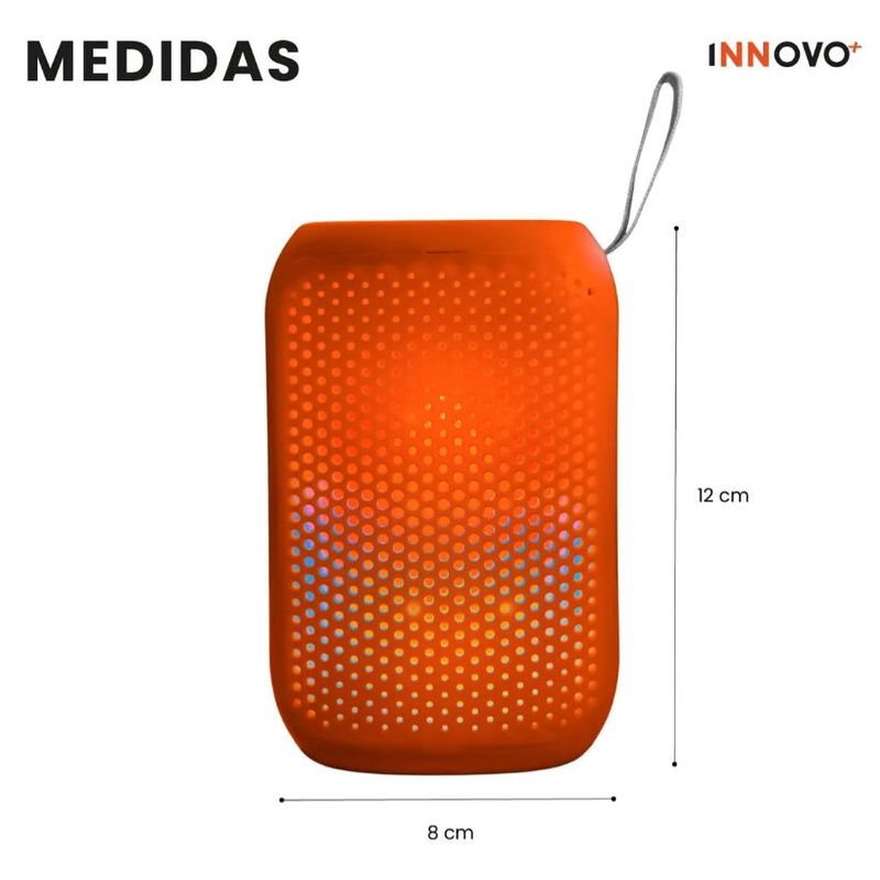 Pequeño por fuera, poderoso por dentro. Su diseño cilíndrico con acabado soft-touch en color naranja vibrante y su luz LED interior crean un efecto visual espectacular para reuniones, espacios interiores, exteriores o tu habitación.