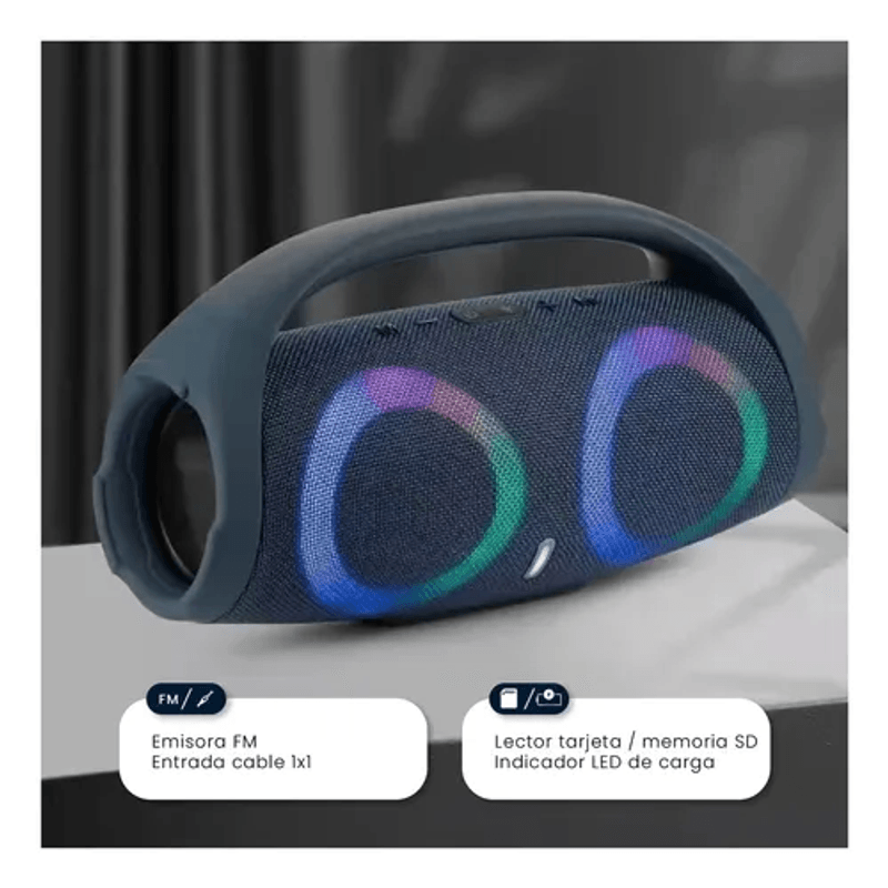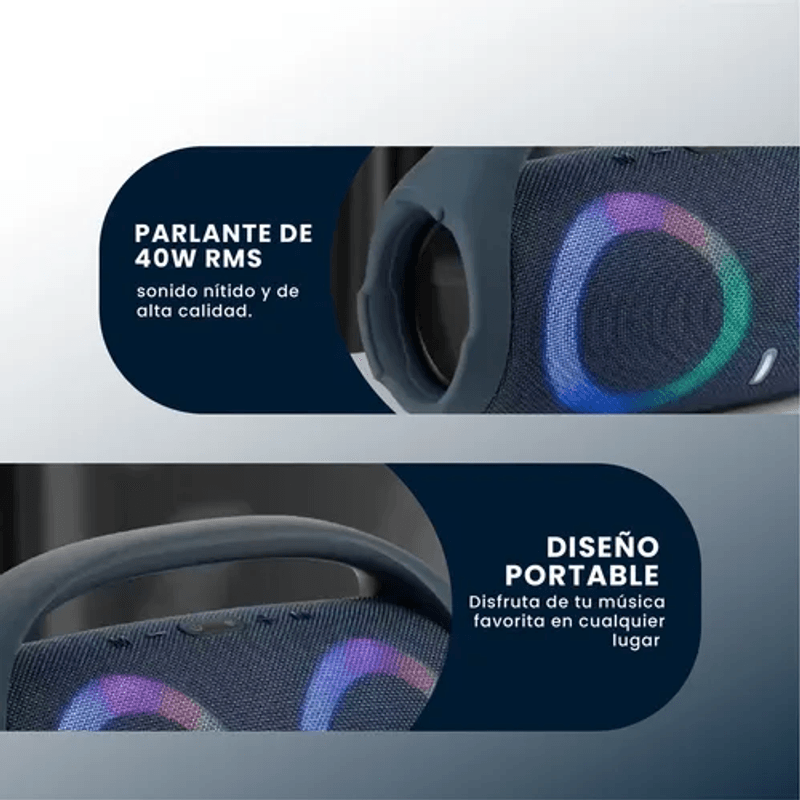 Con Bluetooth, sistema TWS para conectar dos parlantes de forma inalámbrica, y la posibilidad de reproducir desde USB, tienes múltiples opciones para escuchar tu música. Resistente a salpicaduras de agua y con entrada auxiliar, es ideal para usarlo en cualquier lugar. Y lo mejor de todo, ¡su diseño portátil te permite llevarlo a todas partes con estilo!