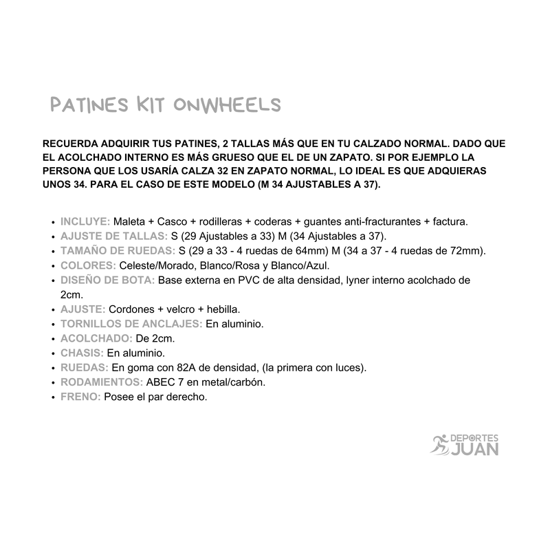 RECUERDA ADQUIRIR TUS PATINES 2 TALLAS MÁS QUE EN TU CALZADO NORMAL. DADO QUE EL ACOLCHADO INTERNO ES MÁS GRUESO QUE EL DE UN ZAPATO. SI POR EJEMPLO LA PERSONA QUE LOS USARIA CALZA 29 EN ZAPATO NORMAL, LO IDEAL ES QUE ADQUIERAS UNOS 31. PARA EL CASO DE ESTE MODELO (S 31 AJUSTABLES A 34).