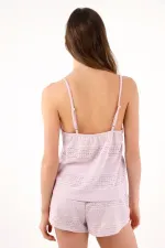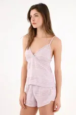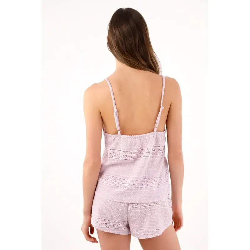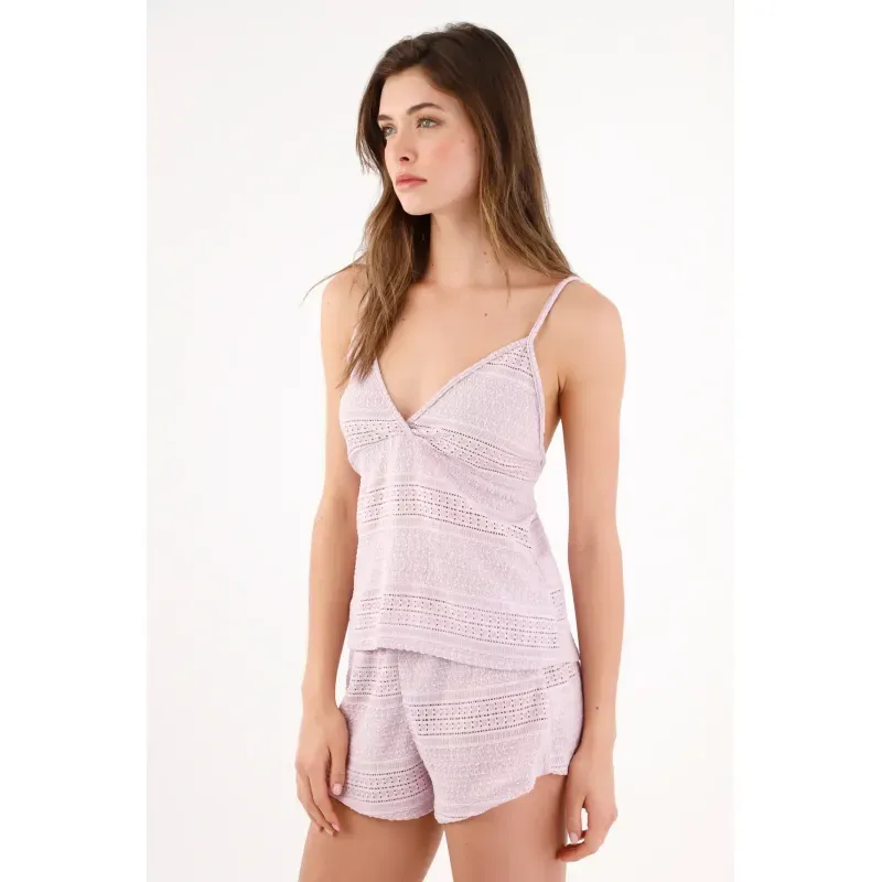 Calado lila que te pone en mood relax al primer vistazo. Este conjunto de pijama de TNS destaca por su textura calada en franjas, un juego visual que suma ligereza y un toque artesanal. El top de tirantes finos con escote en V cruzado estiliza el cuello y realza los hombros con una línea limpia; el short de corte suelto y cintura fruncida cae suave para moverte libre. El tono lila mantiene la vibra tranquila y el algodón aporta confort natural para desconectar sin esfuerzo.