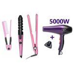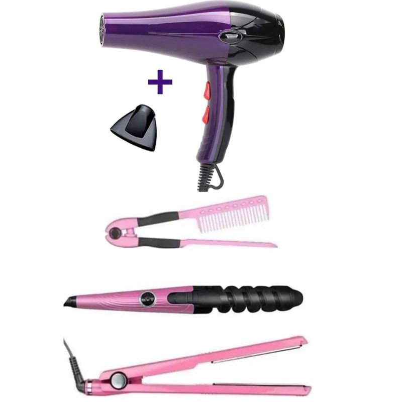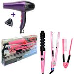 Combo de Plancha + Secador de Cabello + Rizador de Cabello. Este kit es todo lo que necesitas para tener tu cabello radiante y hermoso. El Secador de pelo tiene un poderoso motor de 5000 Watt con 1 boquilla que acelera su secado y estilo. La Plancha le permite equilibrar la temperatura ya que es digital y graduable y alcanza hasta 450°F. El Rizador es en espiral de facil uso y calienta hasta 450°F.