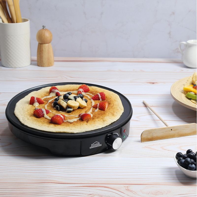 Haz que tus desayunos y pasabocas sean inolvidables con la Plancha Eléctrica Multifuncional Home Elements. Con 1200 watts de potencia, te permite preparar crepes, waffles, tacos, pancakes, arepas y mucho más, de forma rápida y uniforme. Su superficie antiadherente evita que los alimentos se peguen y facilita la limpieza, mientras que su control de temperatura te ayuda a cocinar sin quemar y a optimizar el consumo de energía. Incluye esparcidor de masa para lograr crepes perfectos y cuenta con base antideslizante que brinda estabilidad y seguridad. ¡La herramienta ideal para quienes aman cocinar fácil, rápido y delicioso!