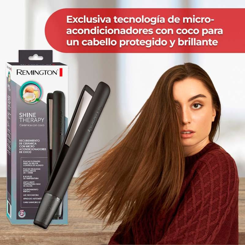 La plancha para cabello de Remington Shine Therapy con placas recubiertas de cerámica con coco puede lograr un cabello protegido y con aspecto brillante. Sus 8 diferentes ajustes detemperatura permiten seleccionar la temperatura que más se adecúa a tu tipo de cabello evitando causar daños en él.