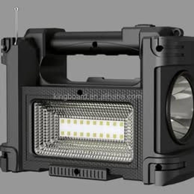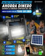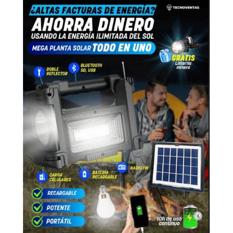 Cuenta con power bank, panel solar, conexiones usb, extension de foco de 2.70 cm. De largo, fm radio,torch function, wireless tecnology