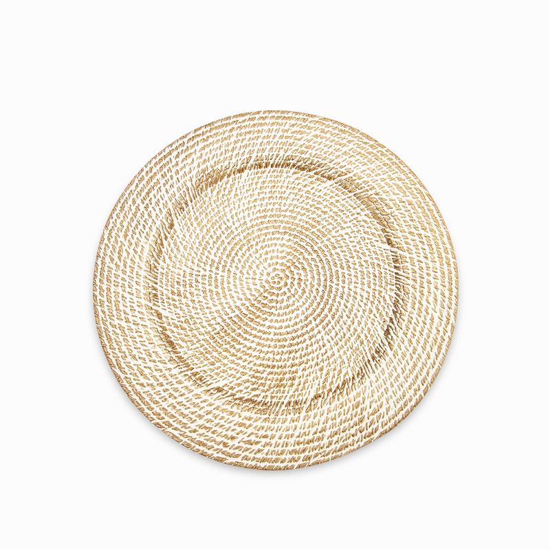 Plato base Frank dorado en polipropileno. Sirve para colocar encima los demás platos de la vajilla, decorando con elegancia y distinción la mesa, complementando la decoración del espacio y reforzando la temática del evento o celebración.