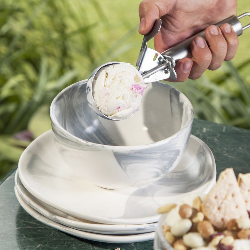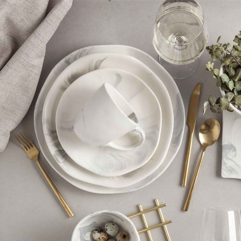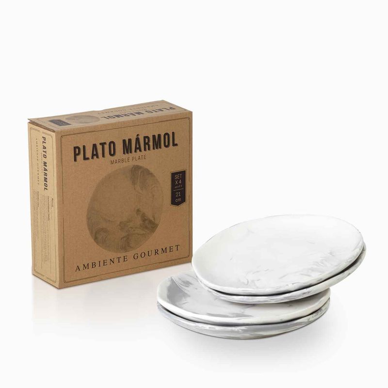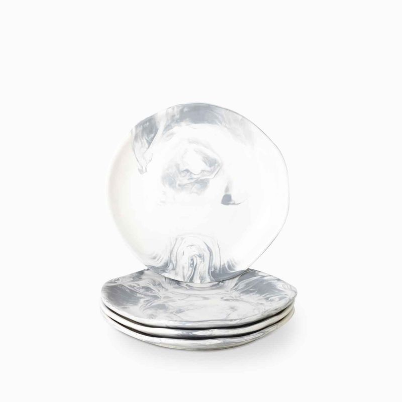 Set x cuatro (4) platos en porcelana con apariencia marmolizada. Ideales para servir para postres y ensaladas. Inspirados en la naturaleza, la arquitectura y el arte mediterráneos.