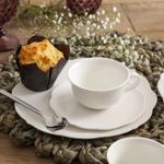 Vajilla con líneas simples y diseño romántico. De calidad hotelera, en fina, liviana y duradera porcelana Bone china, que agrega un elegante estilo vintage a la mesa.