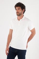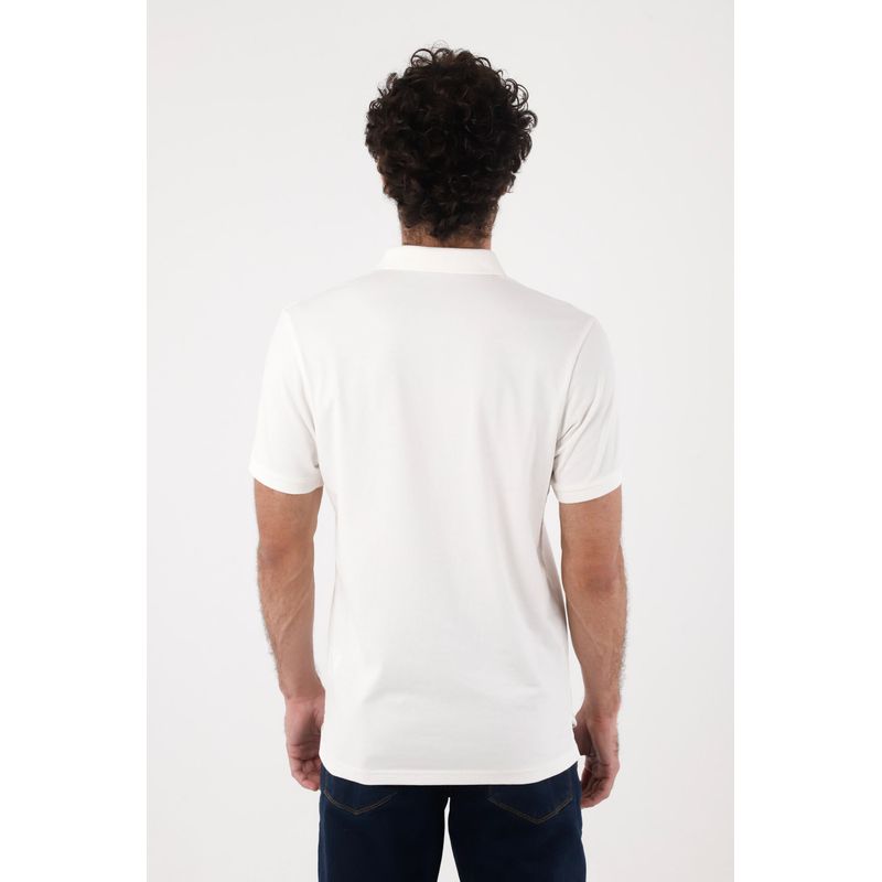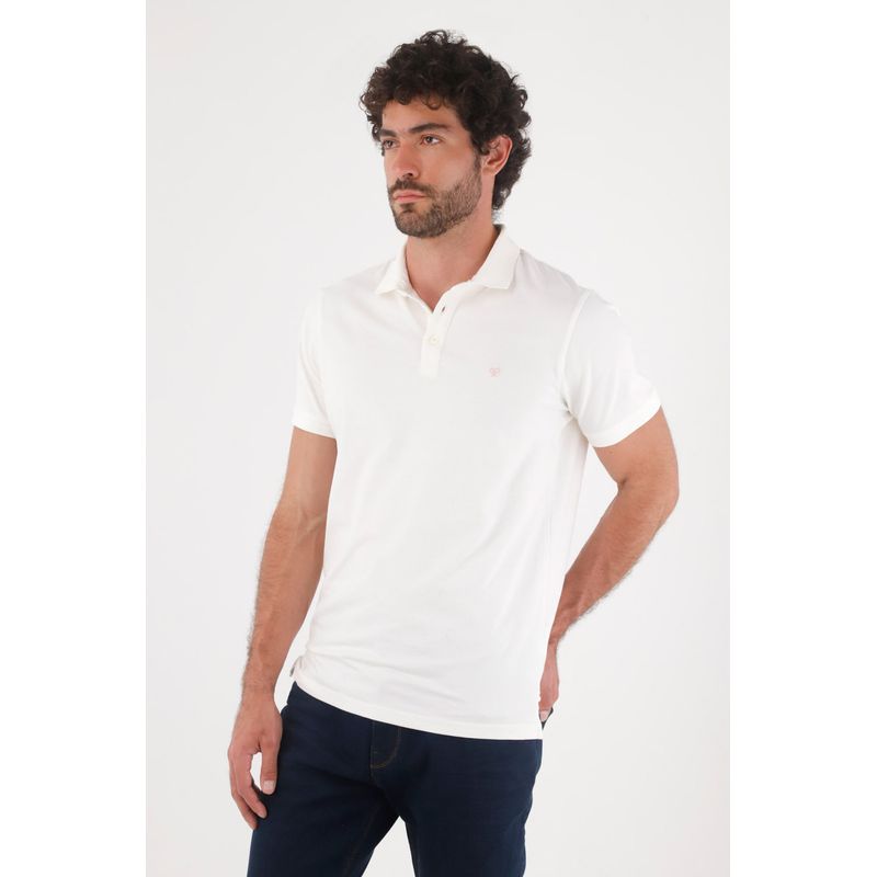Fit & Styling Llévalo como polo para hombre algodón blanco con los dos primeros botones abiertos, por fuera de unos jeans azul oscuro de corte recto; un gesto sencillo que proyecta frescura casual y te mantiene listo para la ciudad, del trabajo a la tarde entre amigos.
