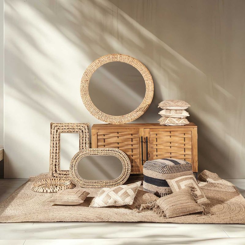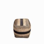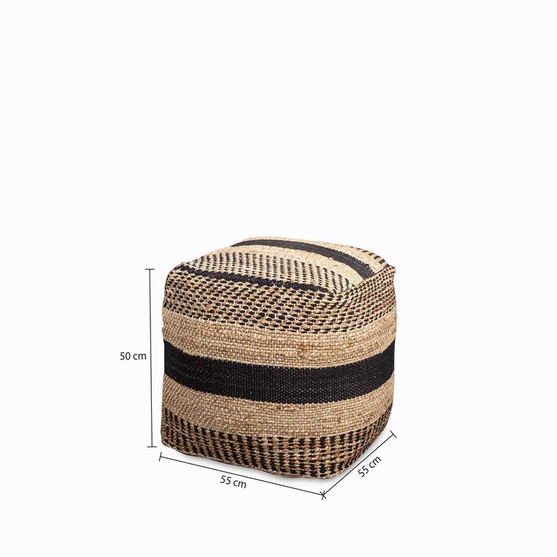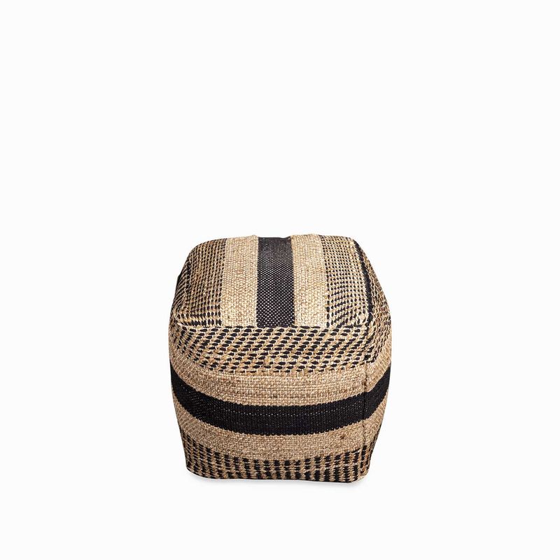 Puff tejido elaborado en yute y lana en líneas de color negro y beige, la solución ideal para usar como asiento o reposapiés en espacios como salas de estar y dormitorios. Con estilo artesanal y aspecto cuadrado que aporta calidez y naturalidad a cualquier espacio.