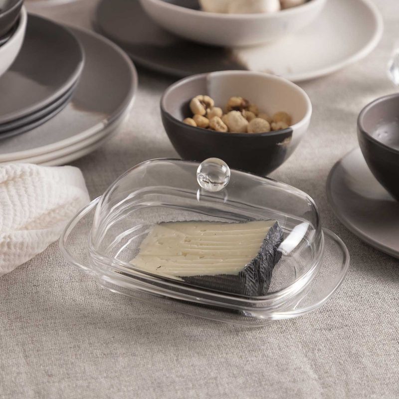 Quesera redonda de acrílico con tapa de domo. Un diseño tradicional que combina bien con cualquier estilo y color. En la mesa, adorna la presentación del queso y lo protege de insectos, polvo u otros elementos que puedan ensuciarlo. En la nevera, lo mantiene fresco y libre de impregnarse de olores y sabores de otros alimentos.