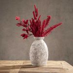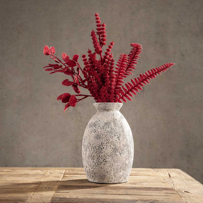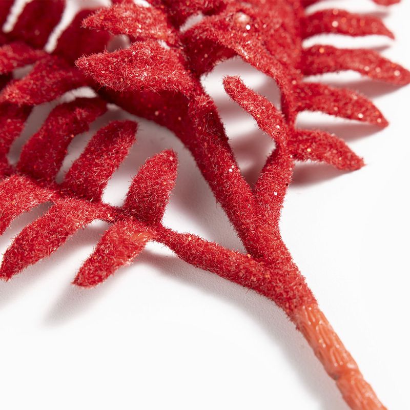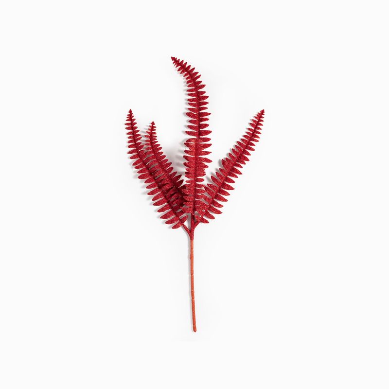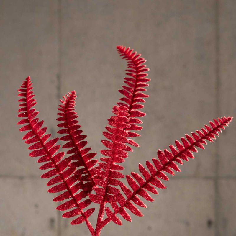 Ramo helecho 63cm de color rojo para la temporada. Es flexible y no atrae insectos. Es ideal para darle un toque natural a cualquier espacio interior. Fácil de cuidar, no requiere de agua, sol o cuidados especiales. Cada planta puede presentar variaciones en su forma.