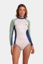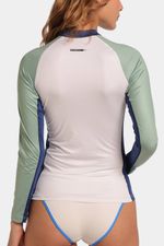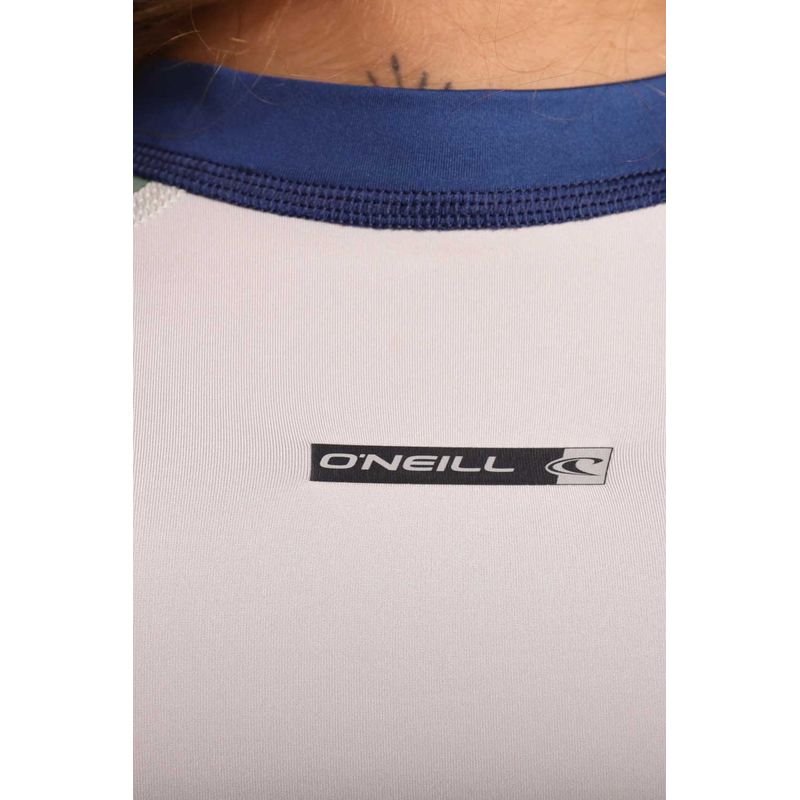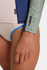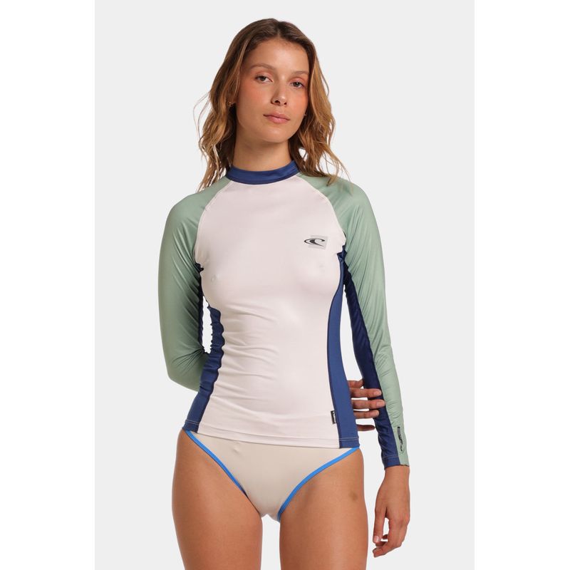 Este Buzo de protección solar beige con diseño de mangas verde oliva pastel y azul, con pequeños detalles de estampado O'Neill en diferentes partes, le da un estilo delicado y comodidad a tus días al aire libre y en el agua.