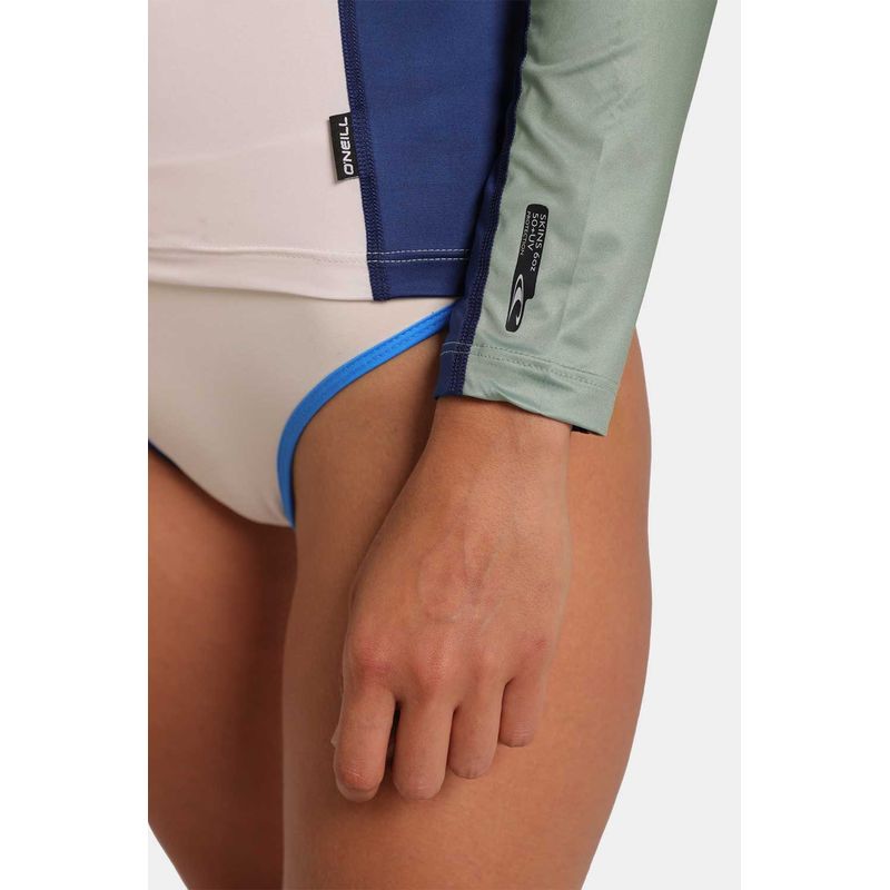 Conoce el Rashguard Manga Larga SKINS para mujer de O'Neill, diseñado para que disfrutes en el agua con todo el estilo y la confianza del factor UPF 50 que brinda protección UV (de los rayos UVB y UVA)