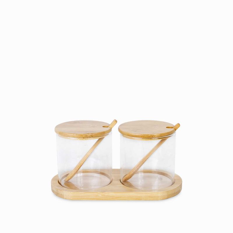 Recipientes para almacenar en set x2 con capacidad de 350 ml, en vidrio con cuchara. Conserva las especias aisladas de agentes contaminantes como son los olores y la humedad. Por su diseño se convierte en un elemento decorativo para la cocina.