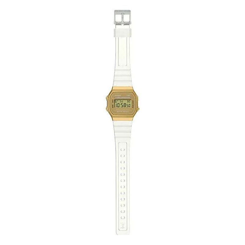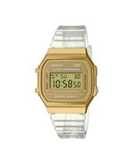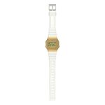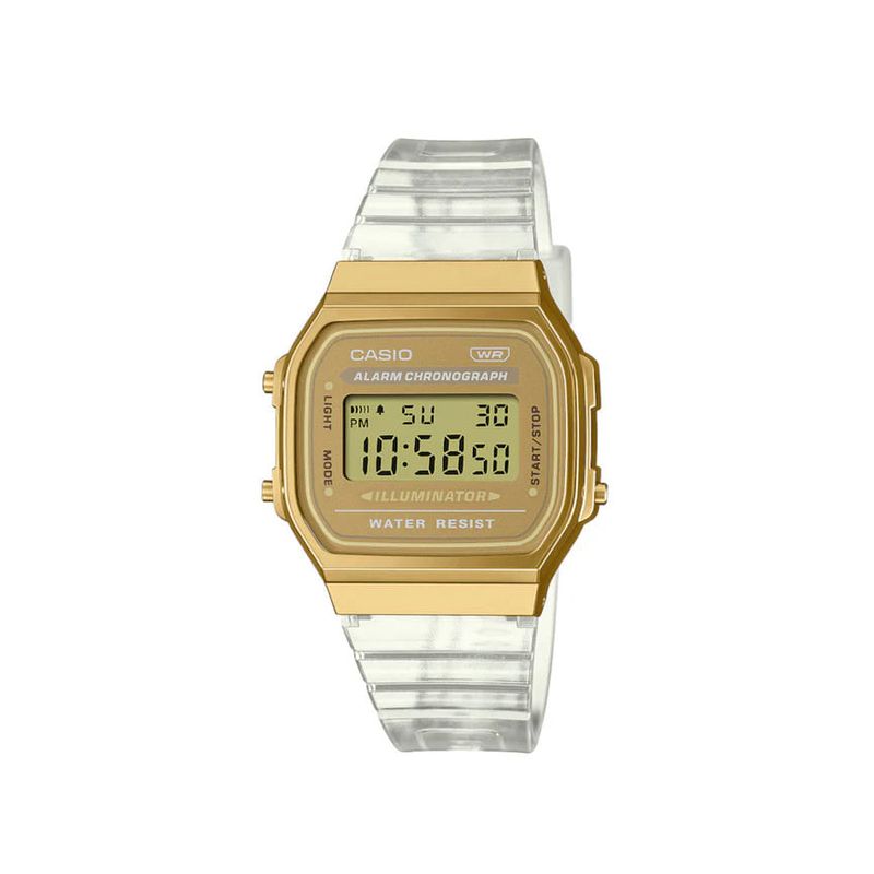 Sumérgete en la nostalgia de los años 80: un reloj digital muy moderno con una caja metálica y una elegante correa traslúcida. Desde su lanzamiento a finales de los años 80, el A168 ha contado con el mismo diseño, que fue el ganador del premio Good Design Long Life Award en 2011. Ahora este popular modelo cuadrado, el A168XESG, está disponible en dorado. No solo cuenta con un diseño excelente, sino también con todas las funcionalidades de un reloj digital, útiles para la vida diaria: retroiluminación electroluminiscente, cronómetro, alarma y una duración de la batería de unos siete años.