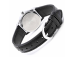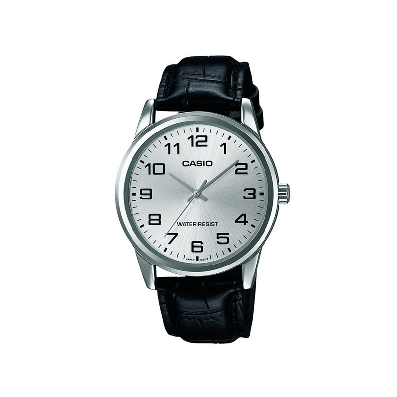 Reloj Casio negro con plateado de moda con correa de cuero. Resistencia al agua 50 metros. Indicador de fecha, día y 24 horas. Caja / bisel: Ion plateado