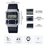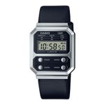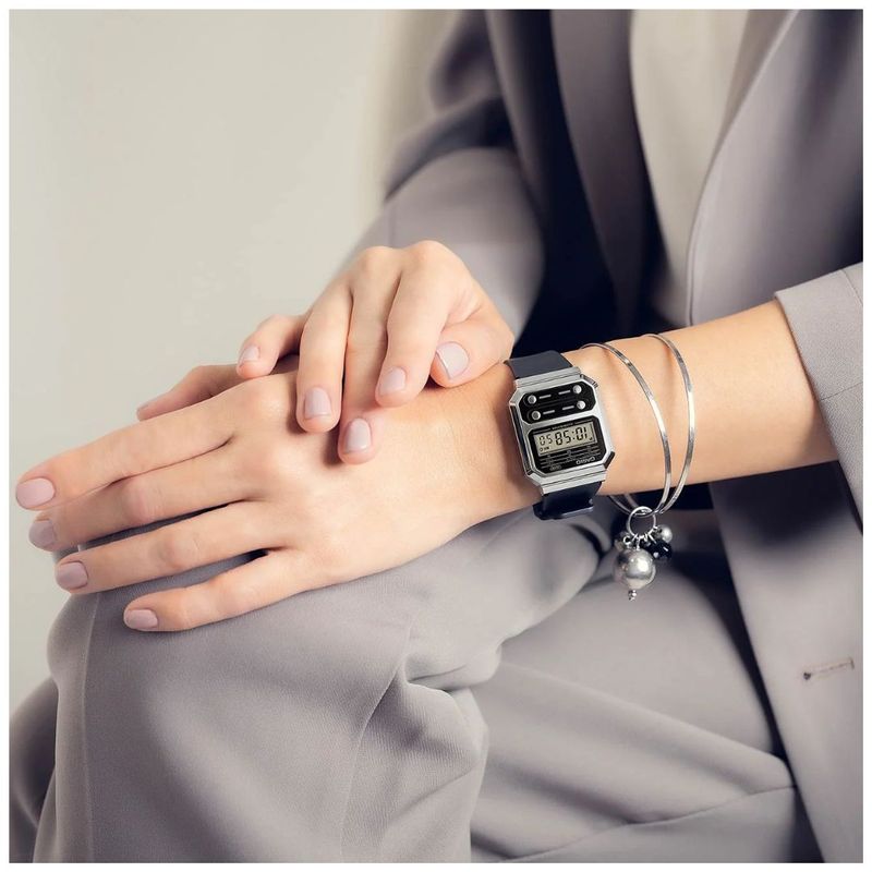 Disfrute de su amor por todo lo vintage con una versión monocromática de un reloj Casio tradicional. Rindiendo homenaje al F-100, el primer reloj Casio diseñado con una caja de resina, la línea A-100 conmemora los cuatro botones frontales icónicos y agrega componentes metálicos de estilo vintage para un reinicio actualizado de un verdadero clásico. De estilo retro pero repleto de funcionalidad contemporánea, este reloj cuenta con cronómetro, calendario, resistencia al agua para uso diario y, por supuesto, una luz LED para una fácil lectura en cualquier iluminación. Utilice el cierre lateral para ajustar fácilmente la longitud de la correa y lograr un ajuste perfecto.