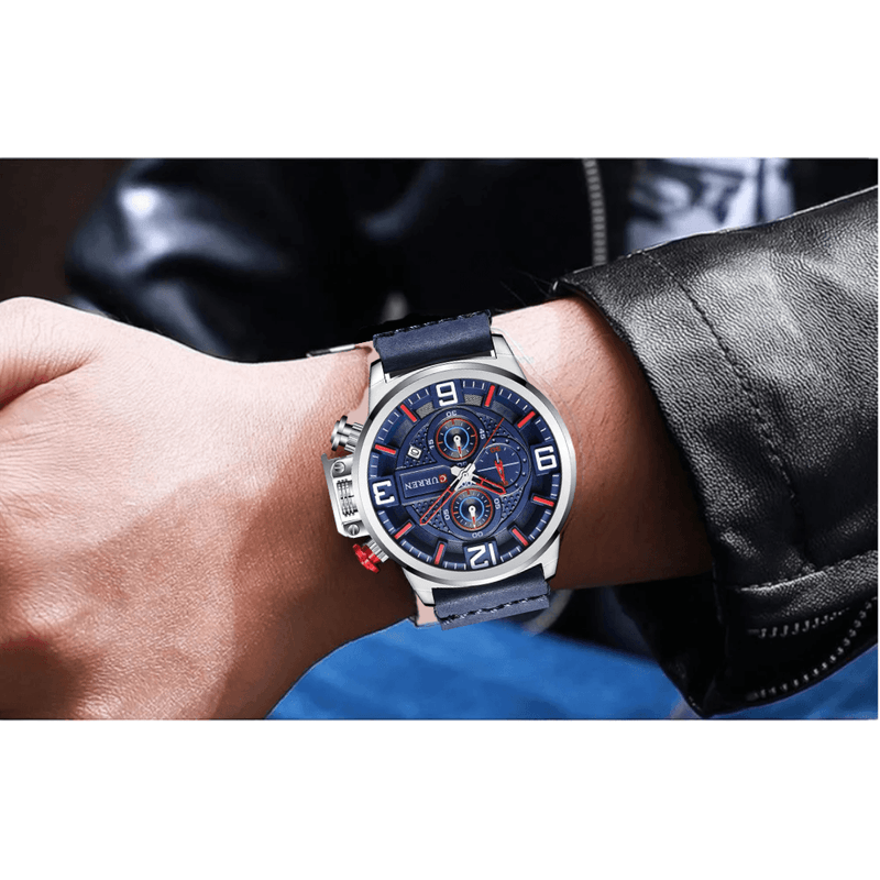 El Reloj Curren 8278 combina elegancia y deportividad en un diseño llamativo con tablero azul y detalles en rojo que aportan fuerza y dinamismo. Su caja metálica plateada junto con la correa de cuero azul lo convierten en un accesorio moderno y versátil, ideal para hombres que desean proyectar estilo y personalidad.