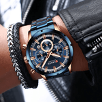 Un diseño imponente que combina el tono azul metálico con acentos dorados para un estilo elegante y moderno. El Curren 8355 está fabricado en acero inoxidable de alta calidad, con función de cronógrafo y calendario, ideal para hombres que buscan un accesorio versátil que destaque tanto en reuniones formales como en looks casuales.