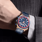 Reloj Curren 8392 ofrece un diseño moderno y llamativo que combina la elegancia del cuero azul estilo cocodrilo con una caja metálica en acabado dorado y detalles en rojo en el bisel. Su tablero azul con cronógrafo multifunción resalta por su estilo único, ideal para hombres que buscan un accesorio sofisticado y lleno de personalidad.
