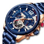 El Reloj Curren Cronógrafo en acero azul combina elegancia y modernidad en un diseño robusto y sofisticado. Su tablero azul con detalles dorados y rojos resalta el carácter deportivo, mientras que la caja y correa metálica aportan resistencia y distinción. Ideal para hombres que buscan un accesorio versátil que proyecte estilo y personalidad en cualquier ocasión.