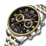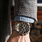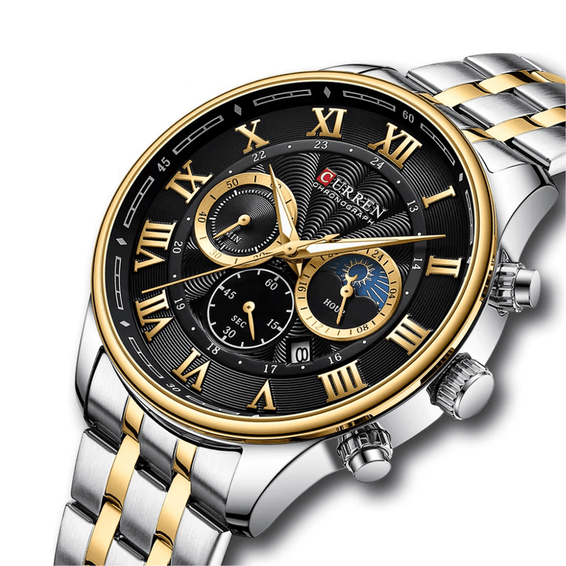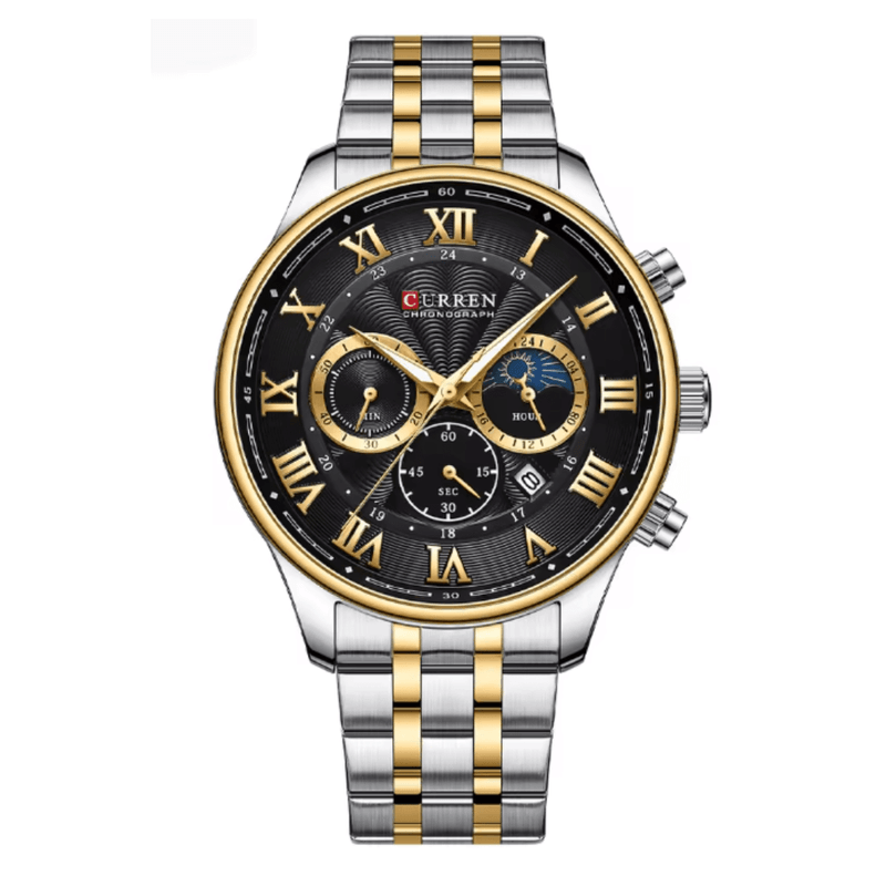 Un accesorio que resalta por su diseño elegante y distinguido. Su combinación de acero inoxidable plateado con detalles en dorado lo convierte en una pieza sofisticada, ideal para hombres con estilo refinado que buscan destacar en cualquier ocasión. El tablero negro con números romanos dorados y subesferas decorativas le aportan un aire clásico y moderno al mismo tiempo.