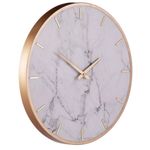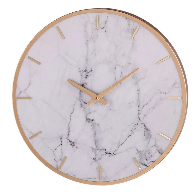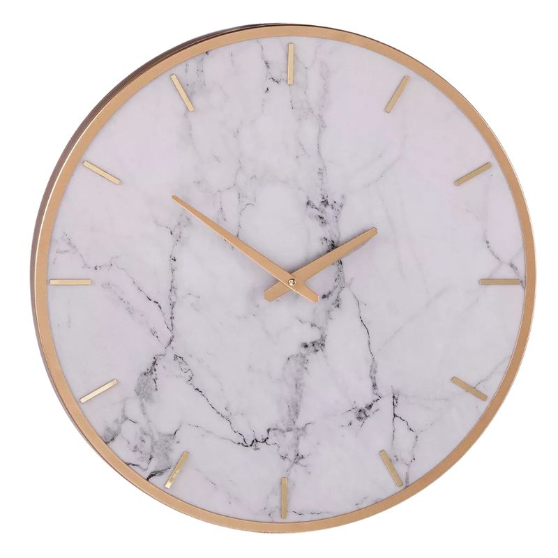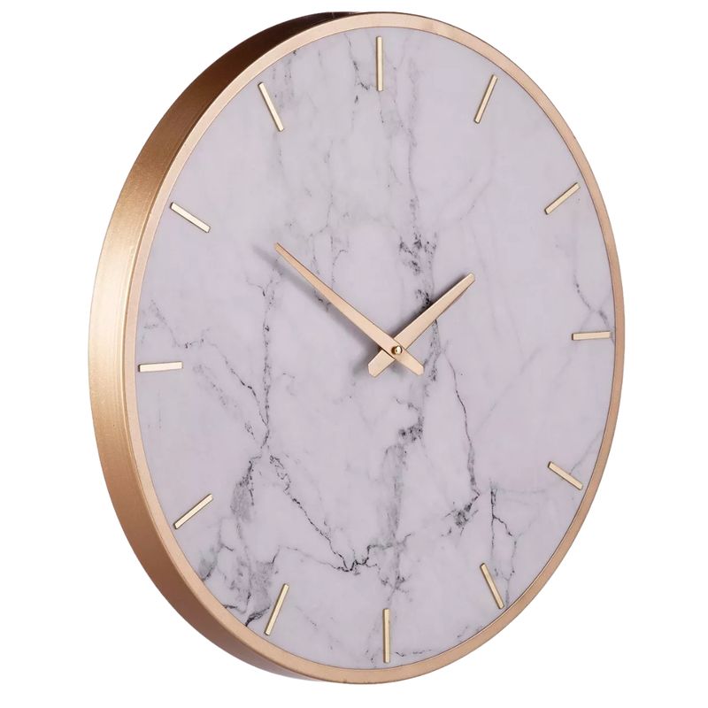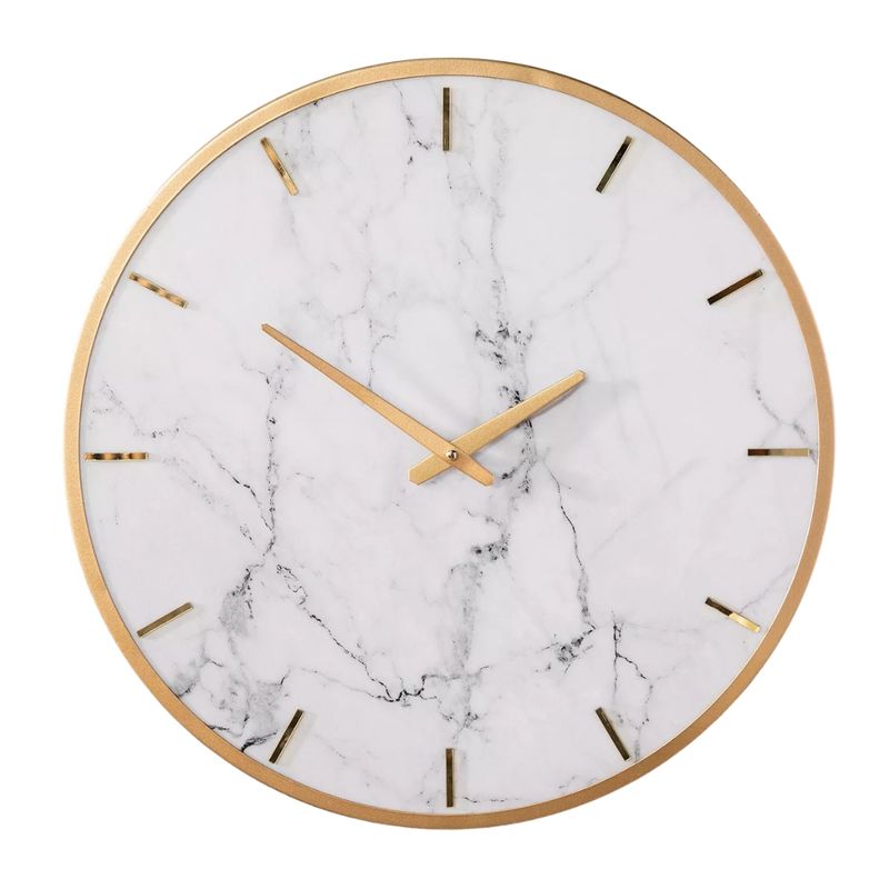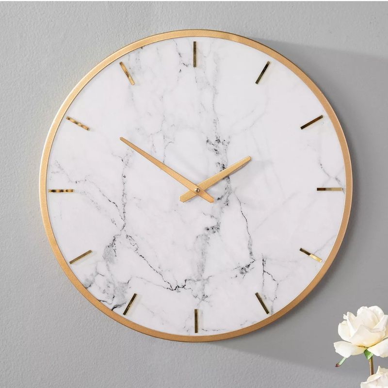 Fabricado con una combinación premium de metal resistente y mármol sintético, este reloj ofrece un diseño inspirado en las tendencias decorativas más modernas. Su fondo en tono blanco con vetas marmoleadas aporta una apariencia lujosa y atemporal, mientras que sus detalles en acabado dorado crean un contraste elegante que realza la decoración del entorno. Cada elemento ha sido cuidadosamente diseñado para brindar un aspecto limpio, exclusivo y altamente decorativo.