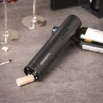 Sacacorchos eléctrico para vino en color negro. Una herramienta sencilla y práctica que permite descorchar botellas con tan solo presionar un botón. En segundos, extrae el tapón de manera rápida y eficiente, y su diseño asegura un ajuste seguro a la botella para una alineación precisa y una extracción exitosa.