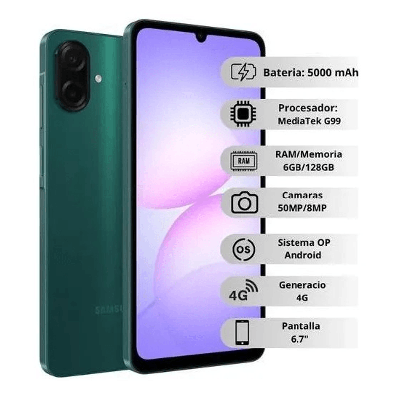 TECNOLOGÍACelularesCelulares libresSAMSUNG GALAXY A07 128GB 6RAM VERDE