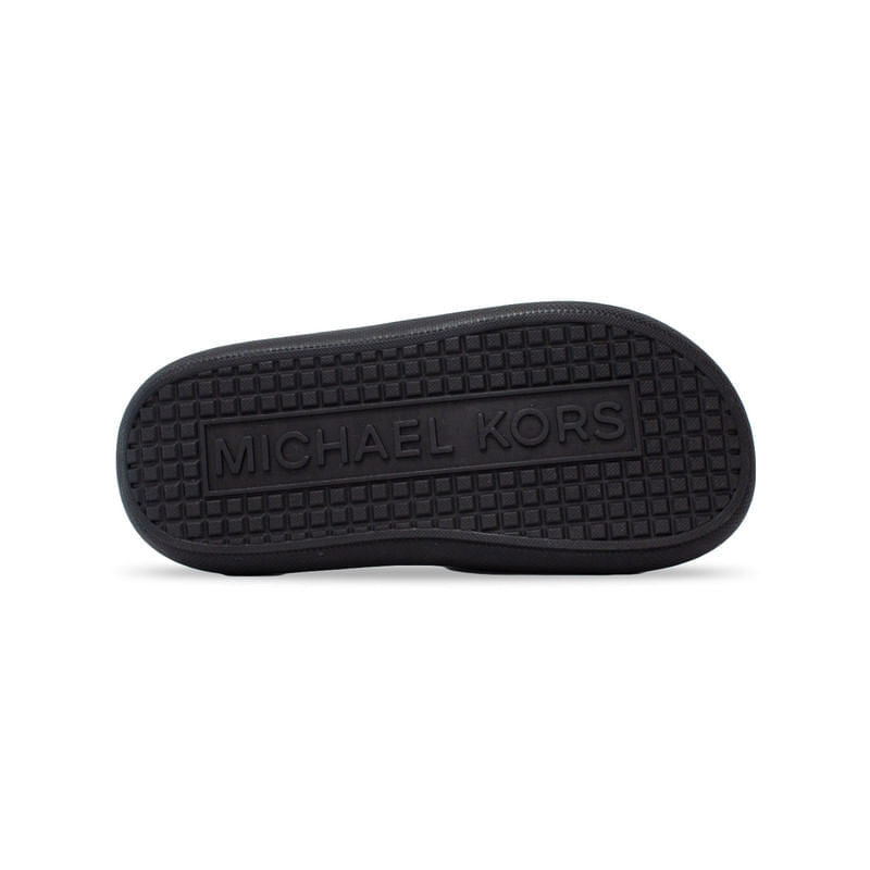 La Raelynn Masyn (ref. MK 01421001C2)es una sandalia slide de estilo sofisticado con un toque sporty-chic. Cuenta con una correa ancha acolchada en la parte superior, adornada con el icónico logo “MK” en forma de monograma metálico que aporta un aire de lujo casual. Perfecta para quienes buscan unir comodidad y estilo, esta sandalia tiene una suela ligera, acolchada y antideslizante, ideal para el uso prolongado tanto en interiores como al aire libre. Su diseño minimalista en color negro (también disponible en tonos claros o plata) la convierte en un básico versátil para outfits de verano, días casuales o salidas informales .