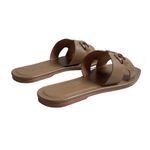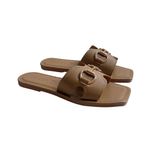 Sandalias Nica café taupe, tipo pala con herraje dorado que le dan el toque chic a cualquier look. Cómodas, elegantes y con vibra de CEO: para las que hacen que las cosas pasen