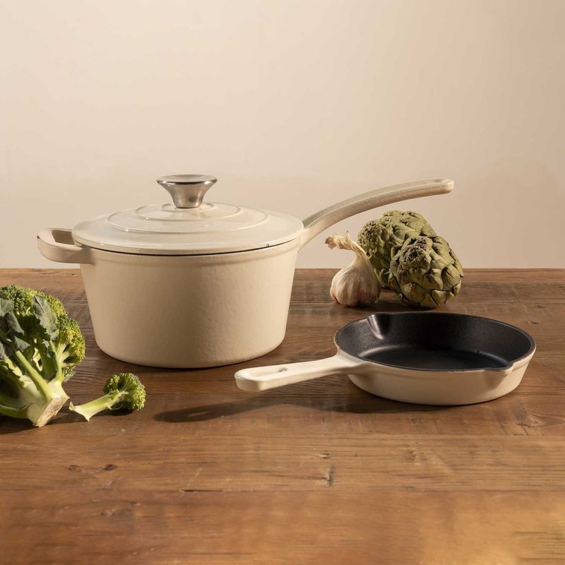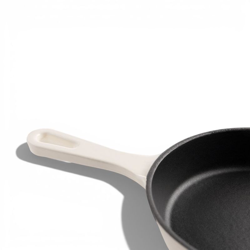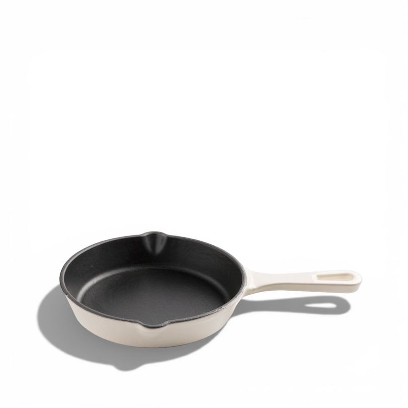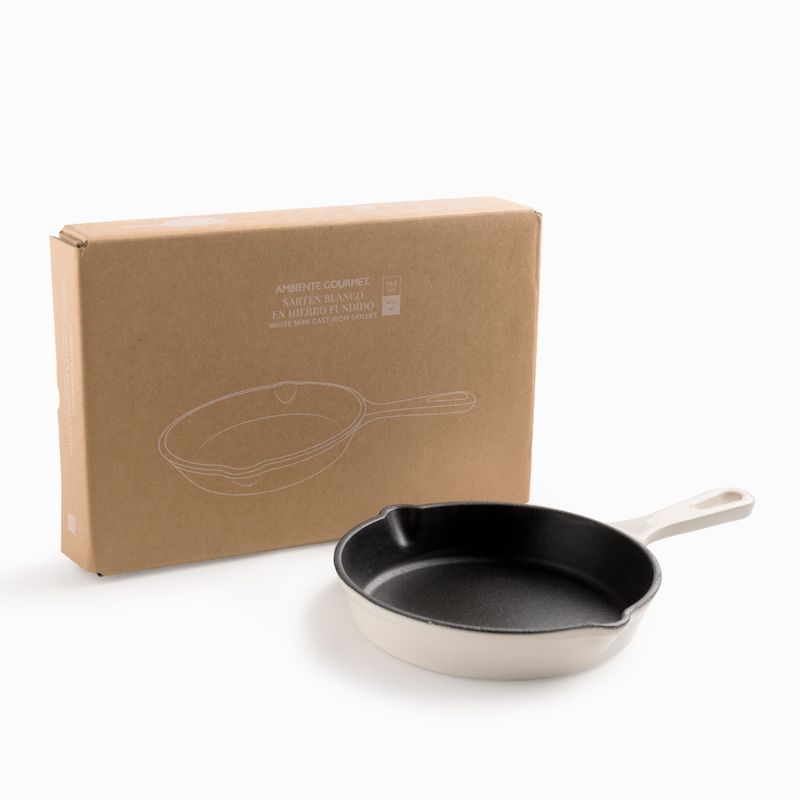Rendimiento térmico profesional: fabricado en hierro fundido, este sartén ofrece una distribución de calor uniforme y una retención de temperatura inigualable. Es la herramienta perfecta para sellar carnes, preparar huevos perfectos, hornear postres individuales o servir entradas calientes (400ml). Su impecable acabado en color blanco lo convierte en una pieza decorativa que permite servir tus preparaciones directamente, manteniendo la comida caliente durante toda la cena.