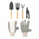 Set de jardín que incluye pinzas de corte, pala ancha, horqueta, rastrillo, guantes de algodón con antiderrapante y bolsa con asa.