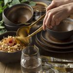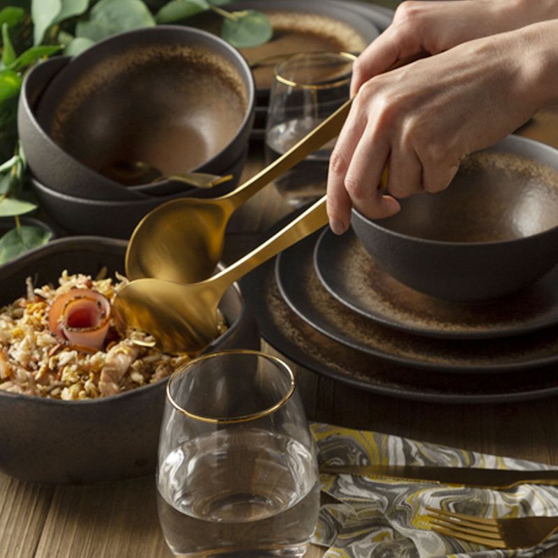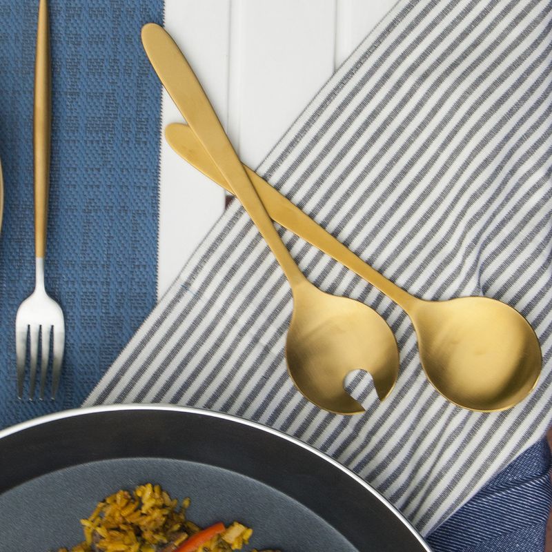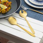 Hacemos tu vida en la cocina más fácil con herramientas adecuadas para cada tarea, este utensilio es ideal para servir alimentos, con material resistente y duradero. El set trae un cucharon y un tenedor de color dorado, diseño de líneas simples y sofisticadas, que complementa los demás elementos de la mesa. No apto para alto tráfico.