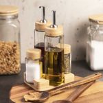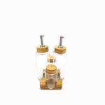 Este set permite mantener sal, la pimienta, el aceite y el vinagre juntos y a la mano tanto en el mesón de la cocinar o en la mesa para sazonar, salero y pimentero tiene una capacidad de 100 ml y aceitera y vinagrera 270 ml. Las botellas permanecen perfectamente almacenadas en el soporte de madera.