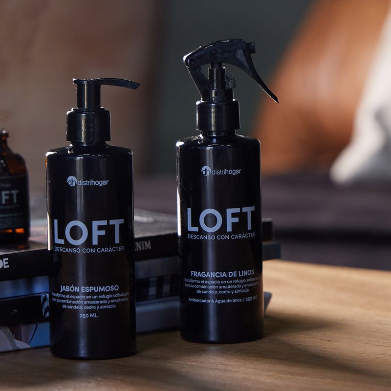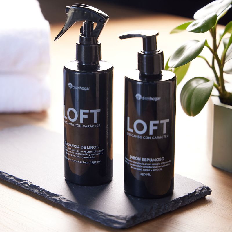 Una colección que interpreta la esencia de lo masculino y lo urbano. Nuestro set de fragancia para linos y ambientes y Jabón espumoso LOFT de 250 ml, transforma el espacio en un refugio sofisticado con sus notas intensas y profundas de sándalo, cedro y almizcle.