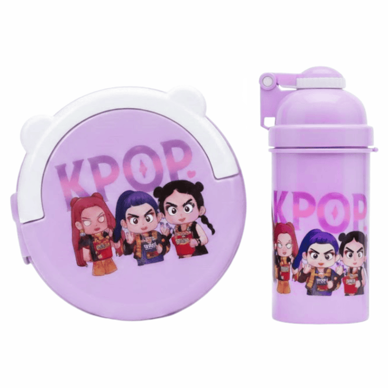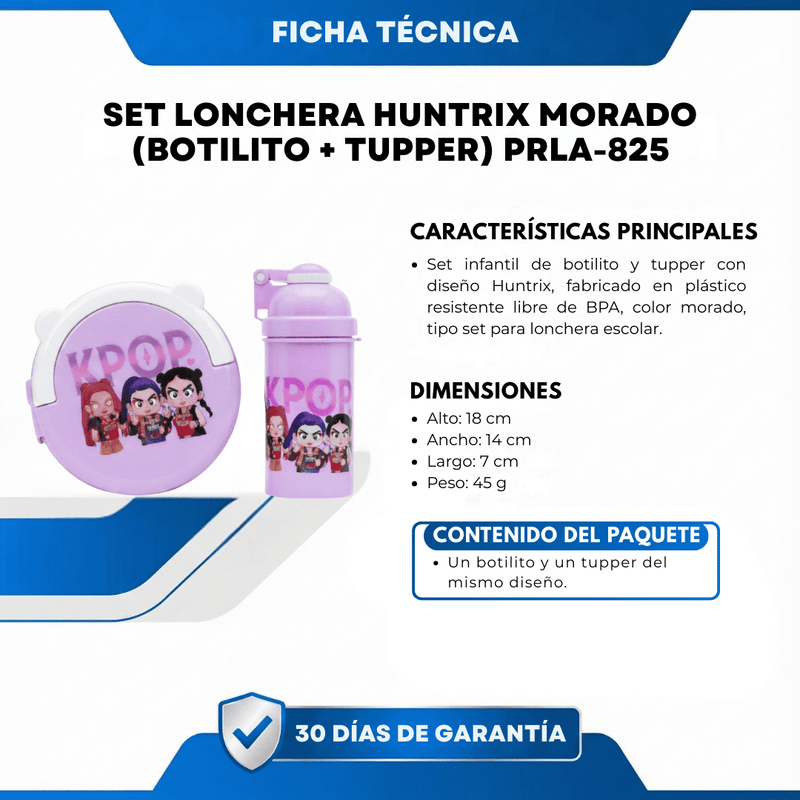 Set infantil de botilito y tupper con diseño Huntrix, fabricado en plástico resistente libre de BPA, color morado, tipo set para lonchera escolar, medidas del botilito 18 cm de alto x 7 cm de ancho x 7 cm de largo, medidas del tupper 14 cm de alto x 14 cm de ancho x 6 cm de largo, peso total aproximado 360 gramos.