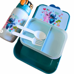 Set infantil de termo y tupper con diseño Stitch, material plástico resistente libre de BPA, color verde agua, tipo set para lonchera escolar, medidas del termo 18 cm de alto x 7 cm de ancho x 7 cm de largo, medidas del tupper 15 cm de alto x 12 cm de ancho x 6 cm de largo, peso total aproximado 350 gramos.