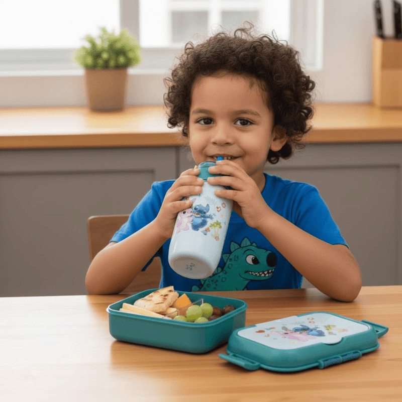 1 termo infantil con tapa segura y 1 tupper para alimentos con diseño Stitch.