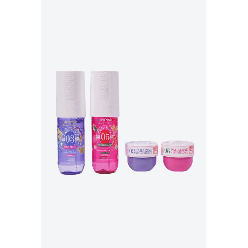 Este set Paradise incluye 2 Splash de 100ml y 2 mantequillas de 30ml, en diferentes fragancias. Son perfectas para disfrutar en cualquier momento del día dejando un aroma duradero y una piel radiante, además de adaptarse a cualquier ocasión.