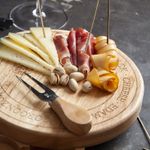 Set circular especial para queso con base de madera y herramientas de acero inoxidable. La solución perfecta para servir, cortar y exhibir quesos madurados y pasantes en la mesa. Su diseño moderno y atemporal destacará en cualquier celebración. Incluye una tabla de madera y cuatro herramientas multipropósito especializadas para punzar, esparcir, untar y sostener todo tipo de quesos.